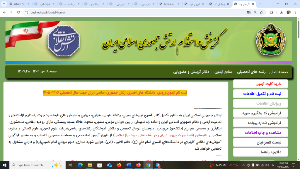 ثبت نام آزمون ورودی دانشگاه های افسری ارتش جمهوری اسلامی ایران جهت سال تحصیلی 1406- 1405 ارتش جمهوري اسلامي ايران هم رزم (دانشجو) ميپذيرد. چه رشته های رو جذب میکنن ؟ داوطلبان درحال تحصیل و دانش آموختگان رشتههاي رياضيفيزيك، علوم تجربي، علوم انسانی و معارف اسلامی و هنرستان (فقط جهت